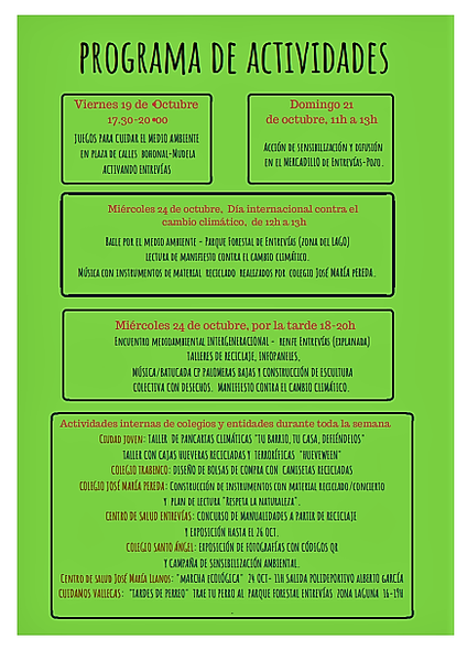 Como parte de las entidades convocantes y participantes, junto a otros grupos, estuvieron en el Parque Forestal de Entrevías, en la zona del lago, donde se leyó un manifiesto contra el cambio climático, y se realizó un concierto al aire libre con los instrumentos reciclados de los alumnos del Colegio Jose María Pereda.