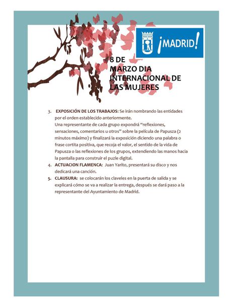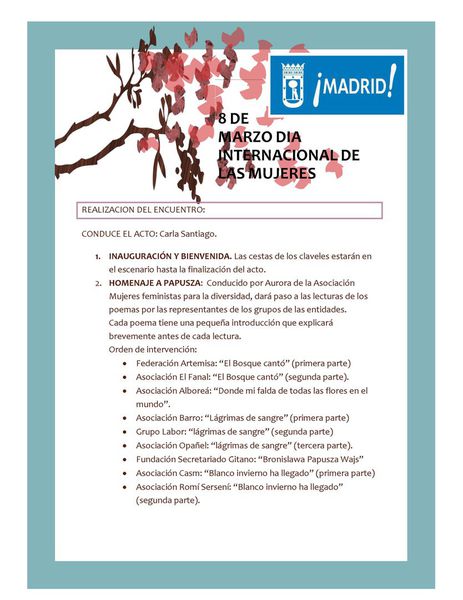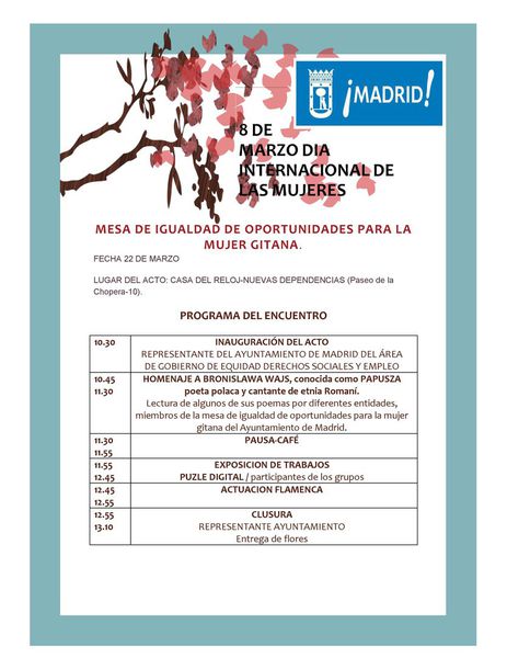 A las 12.00 horas en la Sede del Área de Gobierno de Equidad, Derechos Sociales y Empleo.del Ayuntamiento de Madrid con motivo de la organización del evento con motivo del Día Internacional de las Mujeres. En el apartado de Homenaje Una mujer gitana - Se decide dedicar el evento de este año a Papusza. Poeta gitana europea.
